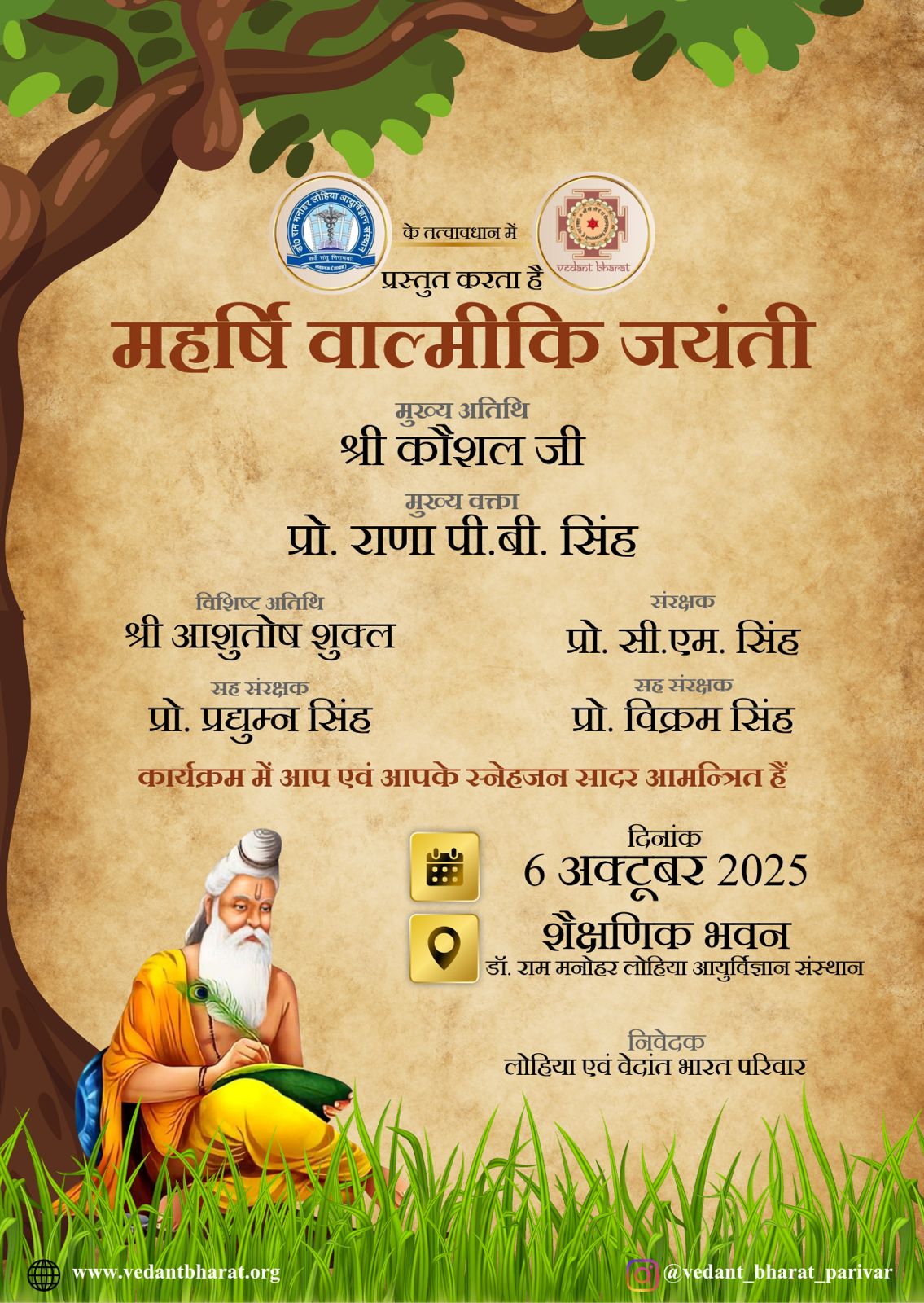 We are thrilled to announce "Valmiki Jayanti 2025" an event dedicated to celebrating the life and ideals of Shri Ram, an epitome of righteousness, courage, and compassion. We extend a heartfelt invitation to all students to participate in and attend this auspicious occasion, taking place on 06/10/2025 at LT 5, academic block,Dr.RMLIMS, Gomti Nagar Lucknow.